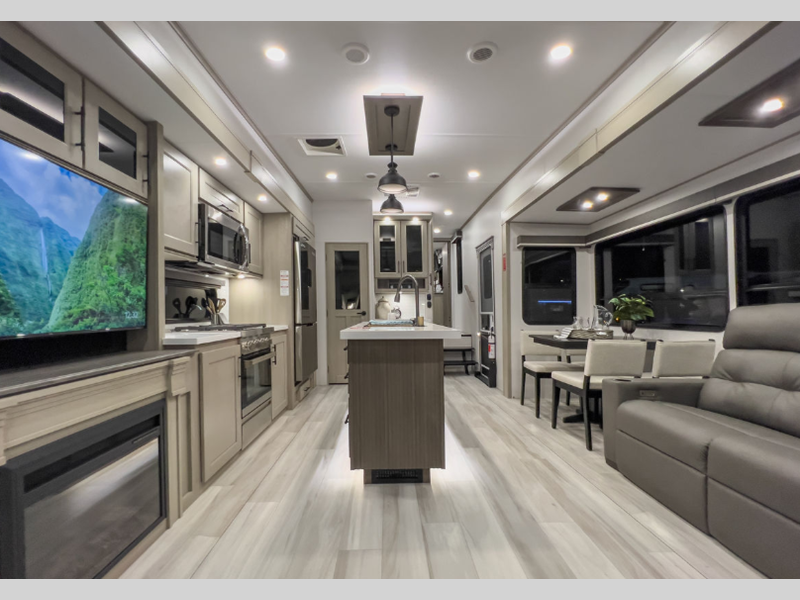 The exclusive Superchassis provides five more inches of width than many fifth wheels in this class which allows you more space to move, breathe, and live. You will enjoy wider sofas in rear lounge models, and space saving doors in all bathrooms. These features give you the space you want without having to add to your tow length. The fully laminated walls and thermal roof design, plus insulated baggage doors and Rail-Tite underbelly seal, ensures your unit is fully insulated including an underbelly with heated tanks and storage so that you can travel in all types of weather easily.